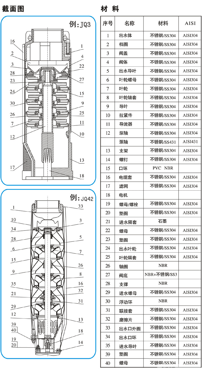 QJ型不銹鋼深井泵是引進國外泵業公司領先的制泵技術生產的高性能耐磨型電泵,動力部份配用目前國際先進技術生產的水浸式不銹鋼潛水電機,對水質絕對無污染,是當前國內外深井泵之精品。選用優質不銹鋼外殼、軸芯、聯軸器、入水座和泵頭(或銅合金入水座、泵頭),高強度抗耐磨新型復合高分子材料葉輪和不銹鋼導流殼,全新“浮動式”結構葉輪在工作期間對電機無軸向壓力。特別適用于工礦業、農業、建筑業、養殖業、食品飲料業及家庭式(或高層送水使用)。