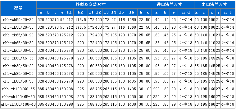 UHB-ZK系列耐腐耐磨泵是一種能適應各種不同的工況條件的泵,如輸送酸、堿性清液或料漿;冶煉行業各種腐蝕性礦漿;硫酸行業各類稀酸;環保行業各類污水等。該泵既耐腐蝕又耐磨損,使用范圍十分廣泛。具有如下特點: