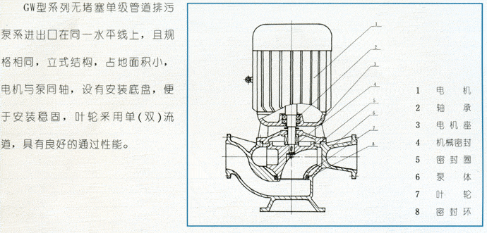 GW型無堵塞管道排污泵是在引進(jìn)國外先進(jìn)技術(shù)的基礎(chǔ)上,結(jié)合國內(nèi)水泵的使用特點(diǎn)而研制成功的新一代泵類產(chǎn)品,具有節(jié)能效果顯著、防纏繞、無堵塞、自動安裝和自動控制等特點(diǎn)。在排送固體顆粒和長纖維垃圾方面,具有獨(dú)特效果。該系列泵采用獨(dú)特葉輪結(jié)構(gòu)和新型機(jī)械密封,能有效地輸送含有固體物和長纖維。葉輪與傳統(tǒng)葉輪相比,該泵葉輪采用單流道或雙流道形式,它類似于一截面大小相同的彎管,具有非常好的過流性,配以合理的蝸室,使得該泵具有效率高、葉輪經(jīng)動靜平衡試驗(yàn),使泵在運(yùn)行中無振動