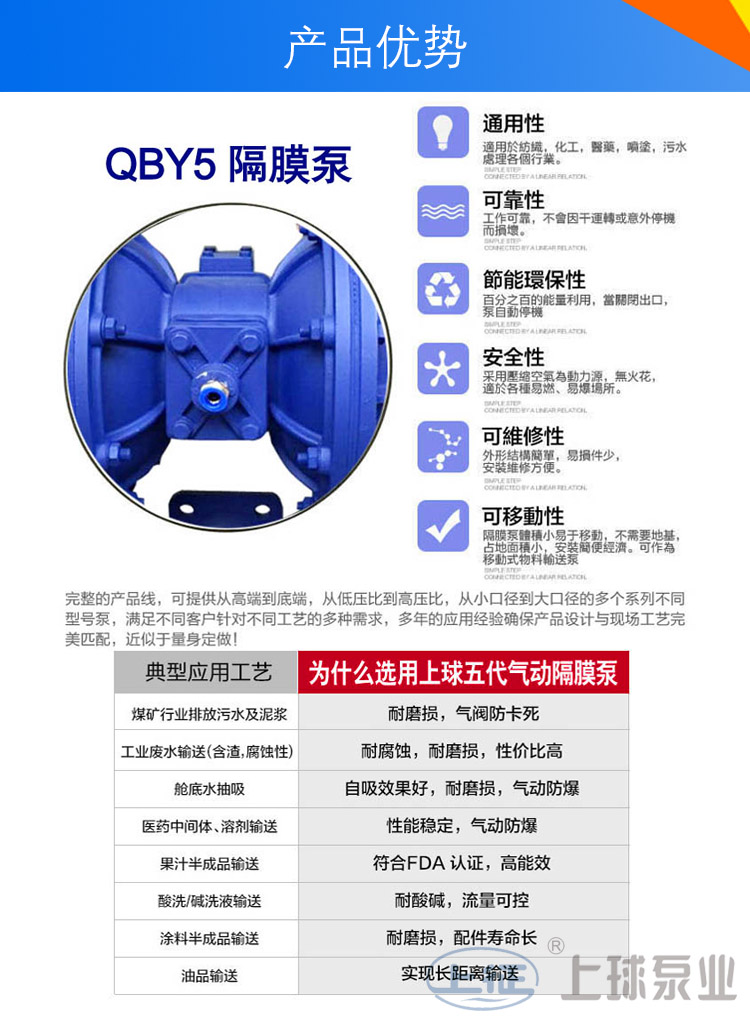 QBY5氣動隔膜泵是我公司開發(fā)的第五代氣動隔膜泵對美國進口氣動隔膜泵與國產(chǎn)氣動隔膜泵的外形進一步改進,機械外觀更加美完;不死機,無油氣動隔膜泵,高吸程隔膜泵,替代進口隔膜泵,國內(nèi)氣動隔膜泵并對性能的進一步加強,效率更高。歡迎選擇上球牌氣動隔膜泵。