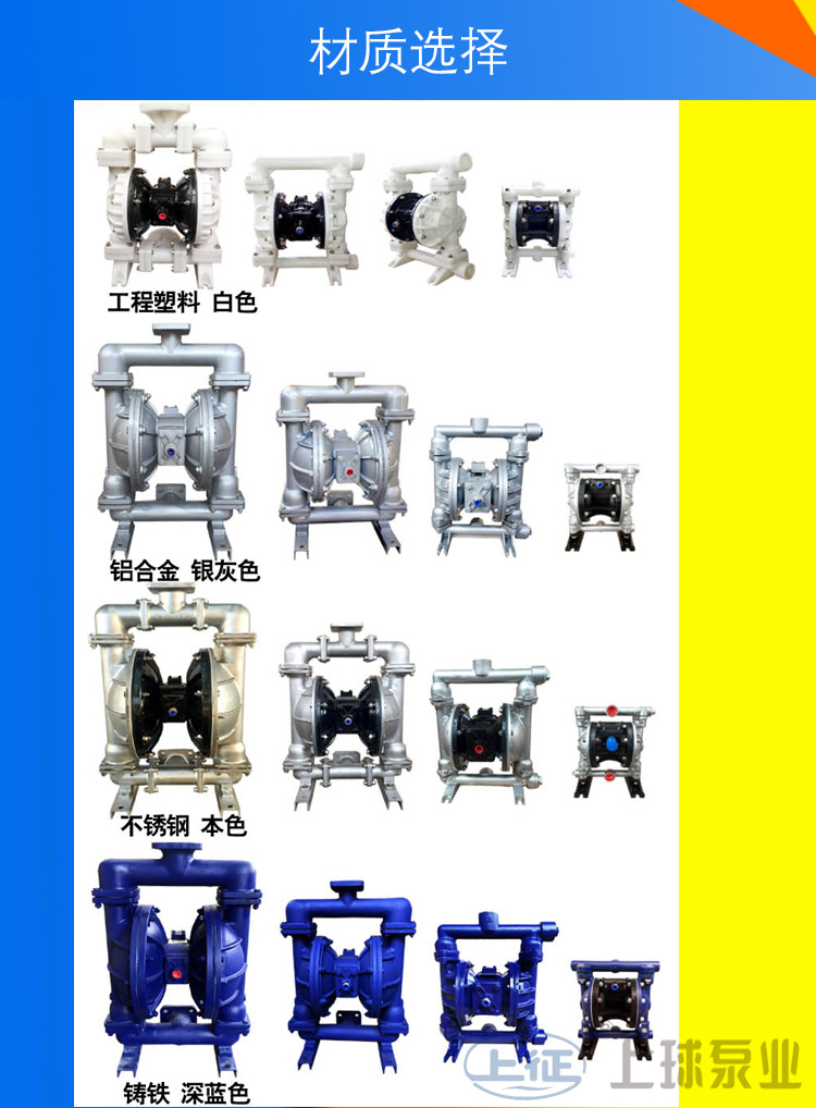 生產(chǎn)的隔膜泵共有十二種規(guī)格。進出口尺寸分別為1/4”(10mm)、1/2”(15mm)、3/4”(20mm)、1”(25mm)、1.2”(32mm)1.5”(40mm)、2”(50mm)、2.5”(65mm)3”(80mm)、4”(100mm)流體部件材質(zhì)有:鋁合金、鑄鐵、聚丙烯、不銹鋼、隔膜根據(jù)不同膜片材質(zhì)分別有:丁晴橡膠、氯丁橡膠、聚乙烯、聚膠、聚醚橡膠、氟橡膠、氟塑料、特氟隆。以滿足不同液體介質(zhì)的需要。