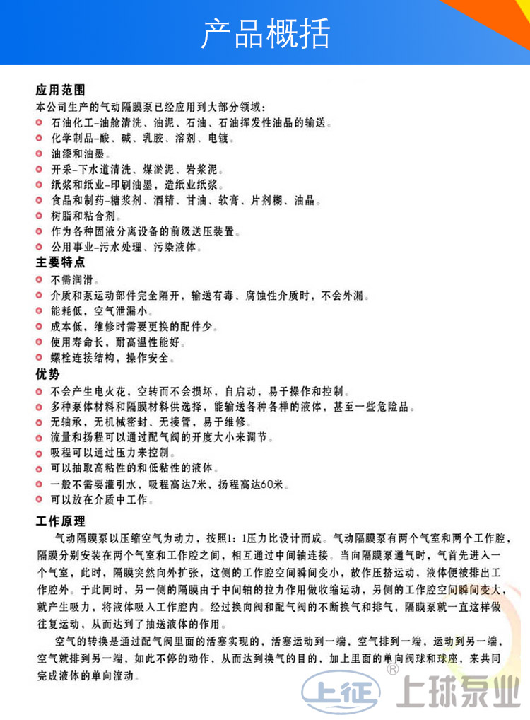 具有使用壽命長、不停機、無需加油的優(yōu)點,即能抽送流動的液體,又能輸送一些不易流動的介質(zhì),具有自吸泵、潛水泵、屏蔽泵、泥漿泵和雜質(zhì)泵等輸送機械的許多優(yōu)點。生產(chǎn)的QBY5系列氣動隔膜泵是一種新型的輸送設(shè)備,是目前國內(nèi)穎新的泵類。采用壓縮空氣為動力源,對于各種腐蝕性液體,帶顆粒的液體,高粘度、易揮發(fā)、易燃、劇毒的液體,均能抽光吸盡。