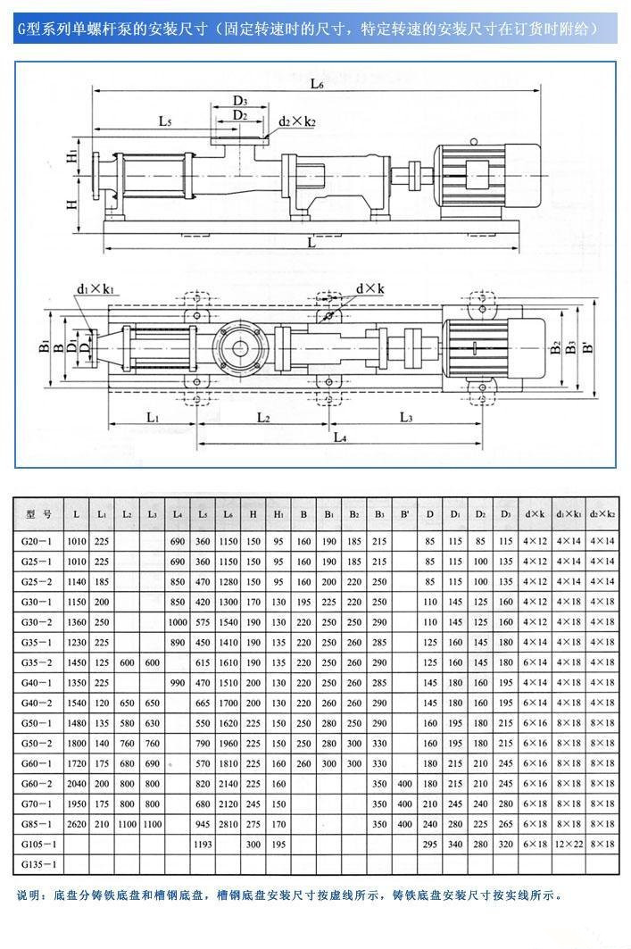 單螺桿是按迥轉嚙合容積式原理工作的新型泵種,主要工作部件是偏心螺桿(轉子)和固定的襯套(定子)。 由于該二部件的特殊幾何形狀,分別形成單獨的密封容腔,介質由軸向均勻推行流動,內部流速低,容積保持不變,壓力穩定,因而不會產生渦流和攪動。每級泵的輸出壓力為0.6MPa,揚程60m(清水),自吸高度一般在6m,適用于輸送介質溫度80℃以下(特殊要求可達150℃)。因定子選用多種彈性材料制成,所以這種泵對高粘度流體的輸送和含有硬質懸浮顆粒介質或含有纖維介質的輸送,有一般泵種所不能勝任的特點,其流量與轉速成正比。 傳動可采用聯軸器直接傳動,或采用調速電機,三角帶,變速箱等裝置變速。